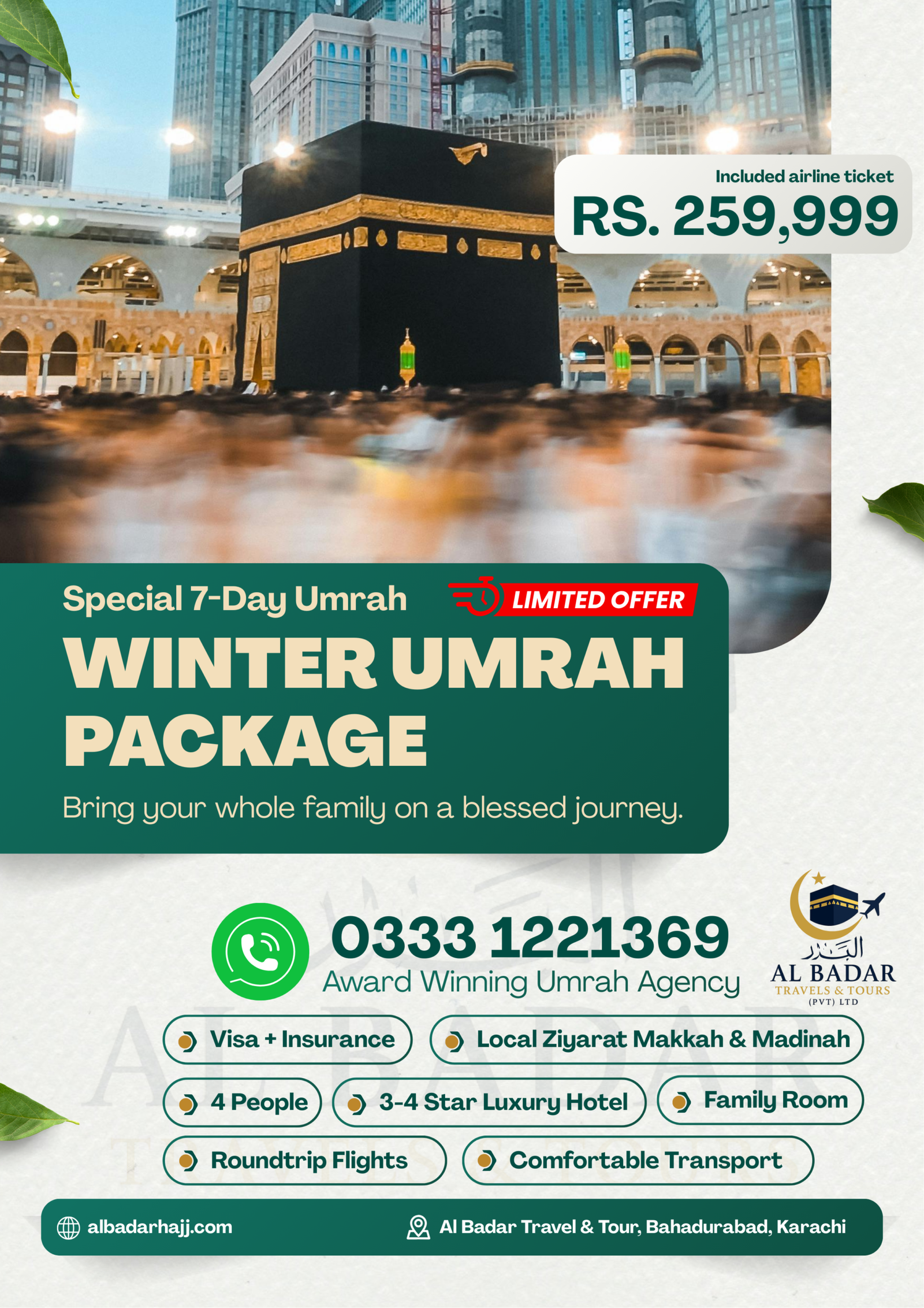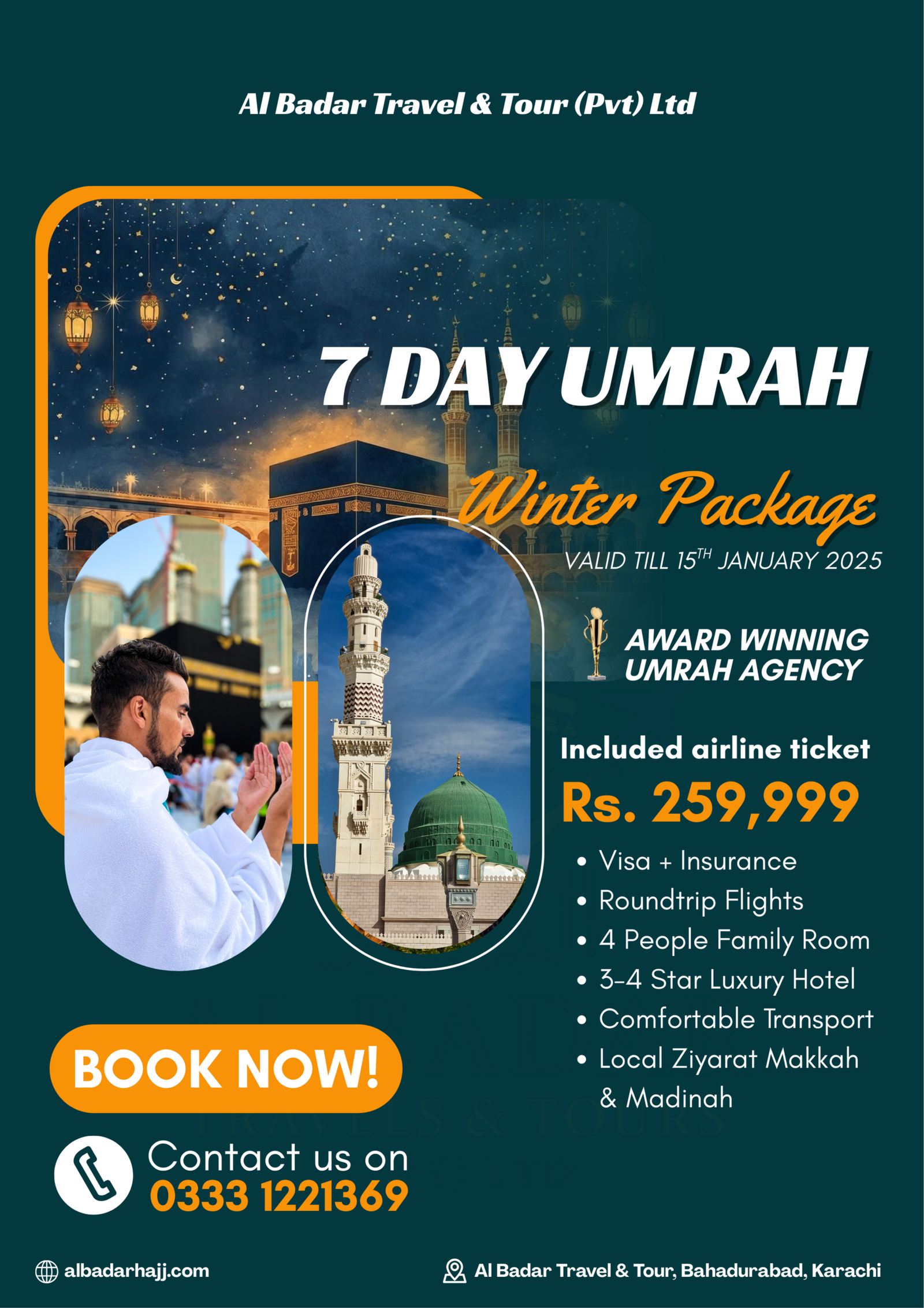 Al-Badar Travel & Tours (Pvt) Ltd is the leisure travel Agency and the most innovative and creative tour operator in Pakistan. As one of the top outbound tour, Hajj and Umrah operators in the country, we have been crafting memorable and creative experiences for our clients for more than 15 years. We deliver quality services at competitive prices. Spurred by our founder’s love for nature, the environment has always a special place in the Al-Badar Travel & Tours (Pvt).